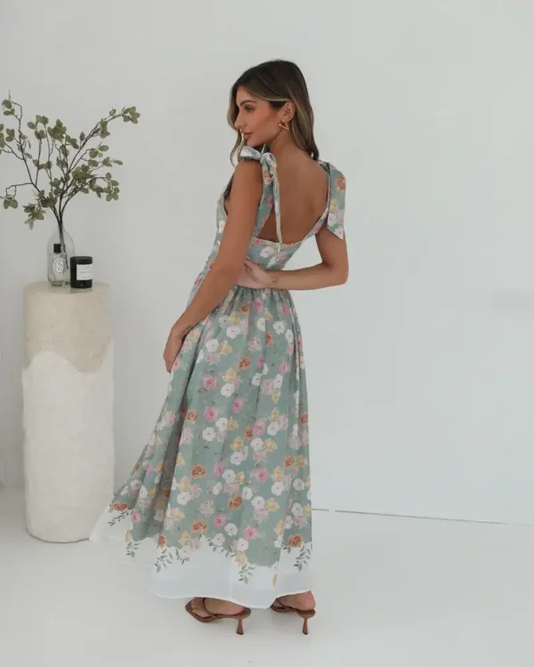 Denne kjolen er normal i størrelsen. Nøkkelfunksjoner: Sløyfestropper. Dykk halsutringning. Smocking på midjen. Flytende skjørt. Maxi lengde nederkant.